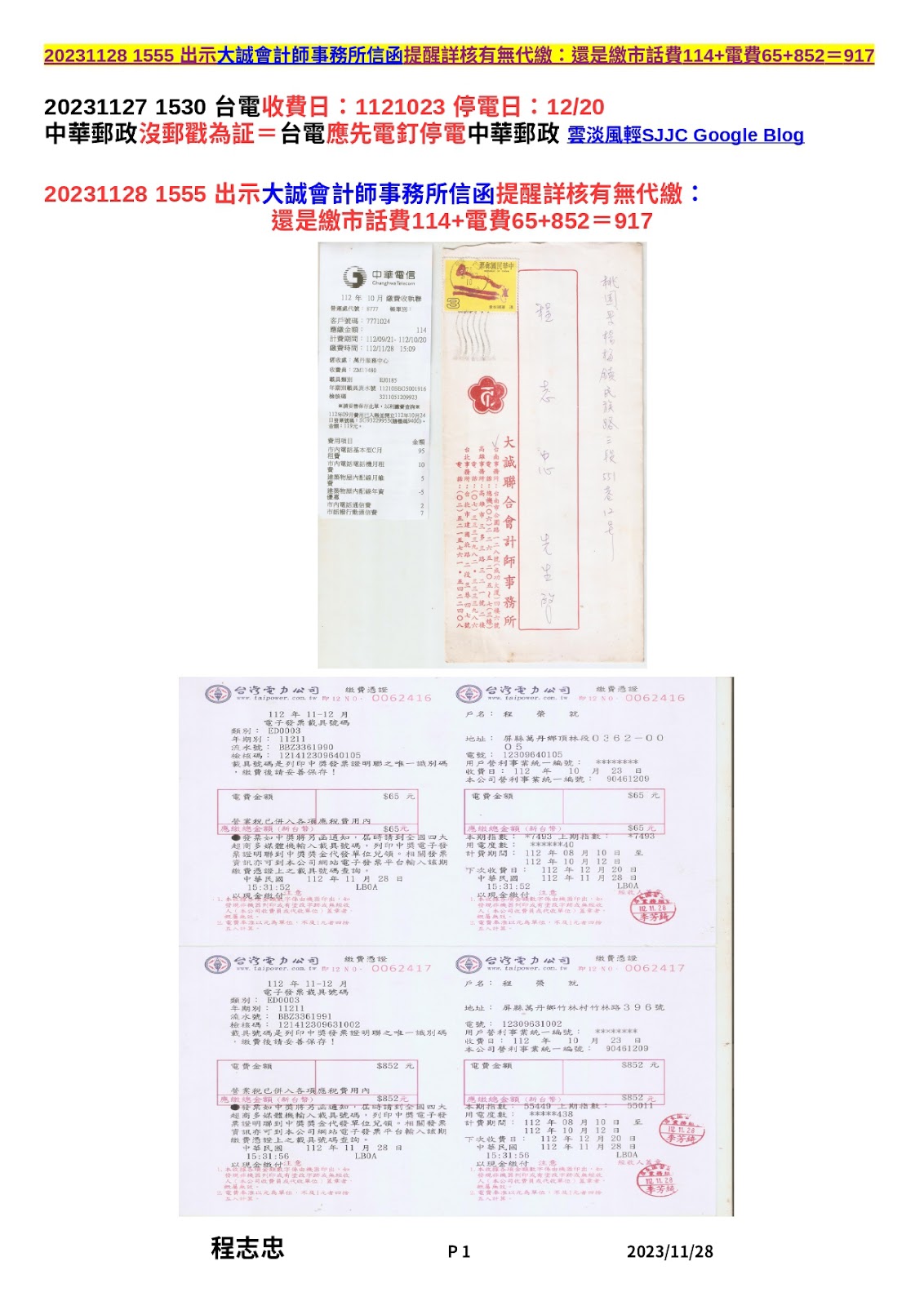 20231128 PM514遠傳蕭小姐催繳1396 訴知自核帳是否已代繳1555 出示大誠會計師事務所信函提醒詳核有無代繳代繳: 依然繳費市話費114+ 電費917